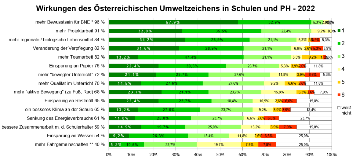 Um das zu evaluieren, wurde im Herbst 2021 eine – alle vier Jahre durchgeführte - Umfrage zur Wirkung des Umweltzeichens durchgeführt. Vierzehn qualitative Fragen und eine quantitative Einschätzung wurden abgefragt. Teilgenommen hat letztlich etwas mehr als die Hälfte der ausgezeichneten Schulen und über 40 Prozent der Berater:innen. Über 2.500 Antworten kamen so zustande.
