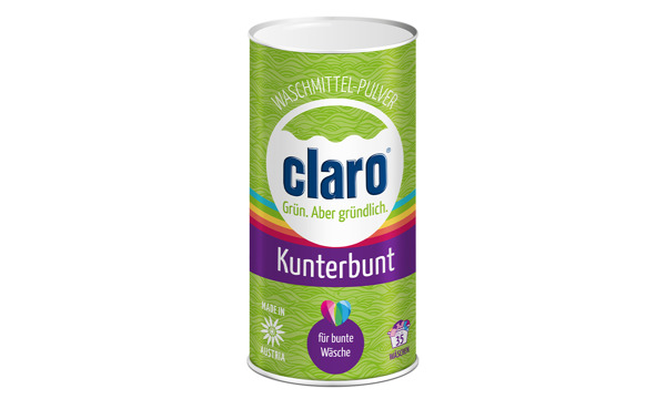 Wir präsentieren: das neue claro Waschmittel-Pulver namens Kunterbunt. Ein wahres Naturtalent, auf Basis nachwachsender Rohstoffe und frei von Mikroplastik.