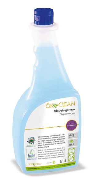 Der Öko Clean Glasreiniger eco 1 ltr. ist ein gebrauchsfertiger, tensidfreier und kältebeständiger Glasreiniger. Er eignet sich hervorragend für alle Fenster- und Glasflächen, z.B. für Vitrinen als auch Spiegel. Dabei trocknet das Produkt rasch und streifenfrei. Ebenso wird die Wiederverschmutzung reduziert. Zum Beispiel werden ölige und fettige Verschmutzungen, als auch Silikonrückstände mühelos entfernt.