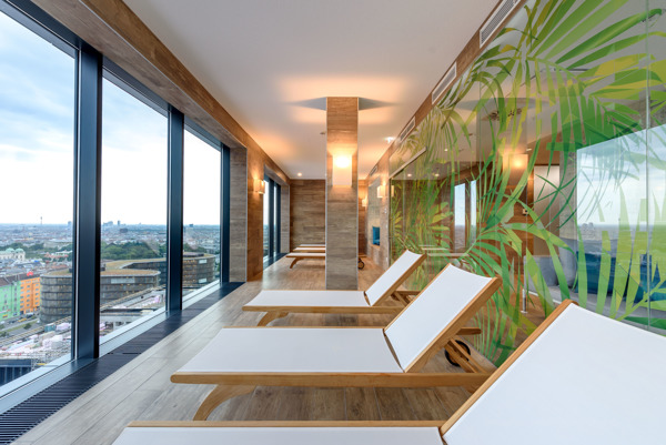 Entspannen Sie im 19. Stock in unserer Sauna und unserem Dampfbad mit Panoramablick über Wien, oder genießen Sie das Wohzimmerambiente des Bar-Restaurants THE FLAVE of Vienna.