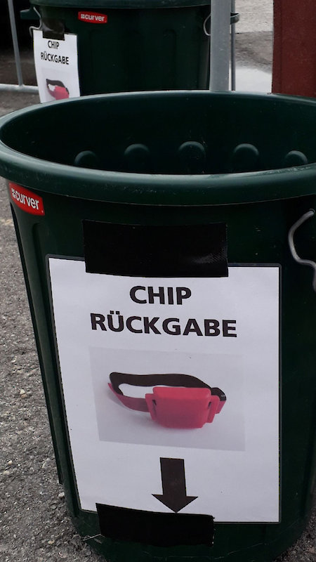 Obwohl die Strecke mit 5 km nicht unüberwindbar lang ist, ist es bei dem schwülen Wetter doch erfrischend, bei der Hälfte eine Wasserstation vorzufinden. Die Becher sind ausschließlich Mehrwegbecher und können leicht wieder in einen der Behälter, die nach der Ausgabe entlang der Strecke stehen, hinein geworfen werden - es liegt kein Müll auf dem Boden über den man stolpern oder auf dem man ausrutschen könnte. Auch im Ziel warten die Becher und werden von den LäuferInnen ordentlich in den bereitgestellten Kübel gestapelt. Die Chips für die Zeitnehmung werden beim Ausgang wieder abgegeben und so ist der einzige Mülleimer, der sich füllt, die Biotonne in der die Bananenschalen landen. Die obligatorische Teilnehmermedaille aus Holz passt dann gut zum Gesamteindruck.