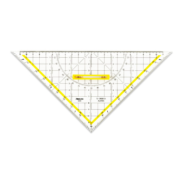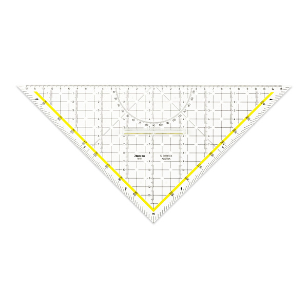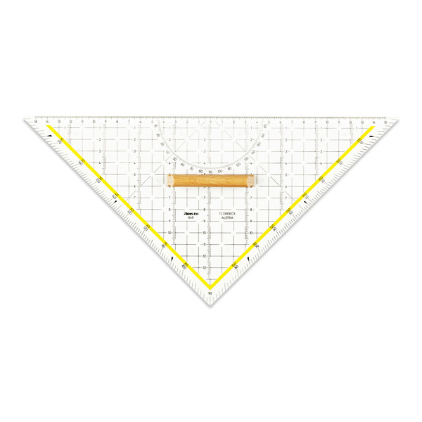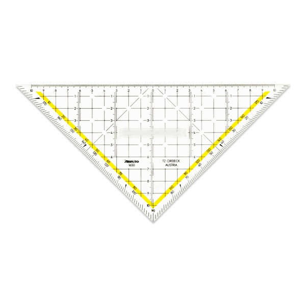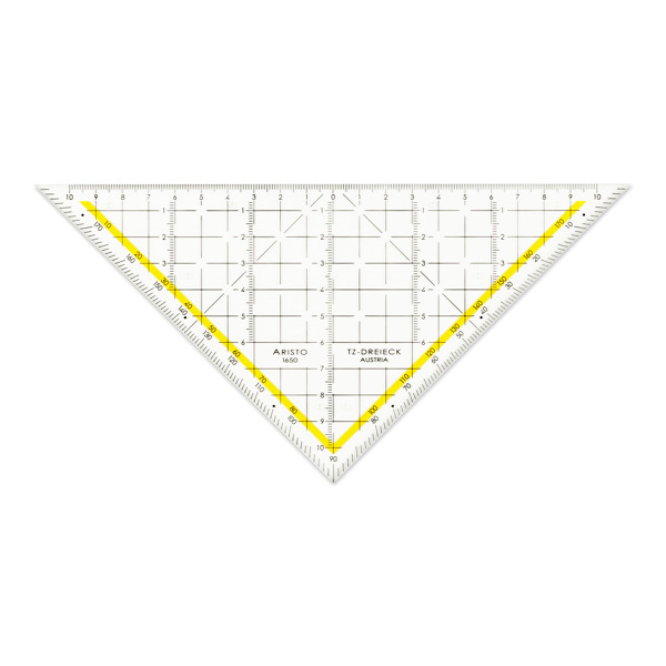 Das TZ-Dreieck 1648 mit einer Hypotenuse von 32,5 cm verfügt über einen Griff und eine Facette zur genauen Strichführung an der Millimeter-Skalierung. Die Tuschenoppen bilden einen Abstand zwischen TZ-Dreieck und Untergrund, um das Verwischen der Linien zu verhindern und die Teilung zu schonen. ARISTO TZ-Dreiecke werden aus glasklarem Plexiglas® in Österreich gefertigt. Dieses maßbeständige Material und die abriebfeste Tiefprägung garantieren die einzigartige Spitzenqualität. Kennzeichen von TZ-Dreiecken sind das 10 mm Gitternetz, Millimeter-Teilungen senkrecht zur Hypotenuse, markierte Winkel in 7° und 42° für perspektivisches Zeichnen, in 75° für Schrägbeschriftung und 45° Linien für leichteres Schraffieren.  Die gelb hinterlegte Winkelskala ist ein Erkennungsmerkmal der ARISTO Geo- und TZ-Familie, Teilung und Beschriftung entsprechen der Ö-Norm.