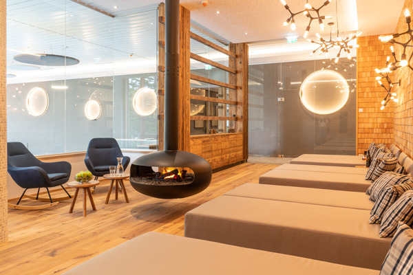 Der Duft des Zirben- und Eichenholzes begleitet Sie noch bis in den 1.000 m² großen Wellnessbereich. Dieser bietet Panorama-Außensauna, Außenpool, finnische Sauna, Dampfbad, Infrarotkabine und Schwimmbad. Groß eingerahmt schmücken Bilder aus gepresstem Heu und Wildblumen den gesamten Wellnessbereich, Heuschindeln, Harpfen und ein offener Kamin machen die einzelnen Bereiche so richtig gemütlich. Die neue Wellnessoase wurde außerdem mit privaten Kuschelnischen und Hängeliegen ausgestattet. In den großzügigen Räumen findet jeder seine persönliche Art zu entspannen.