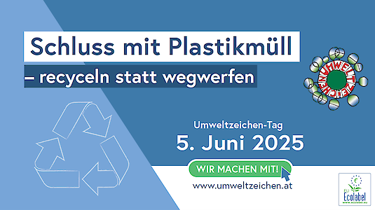 Unter dem Motto „Schluss mit Plastikmüll - recyceln statt wegwerfen““ rufen wir Lizenznehmer und Partner des Österreichischen Umweltzeichens auf, ihr Engagement für den Klimaschutz rund um den Umweltzeichen-Tag am 5. Juni 2025 sichtbar zu machen.