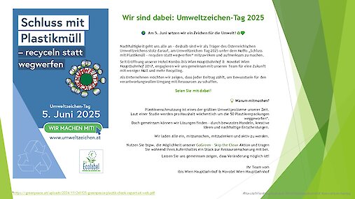 Als Träger des Österreichischen Umweltzeichens werden wir mit einer Plakataktion am Areal auf die Themen Plastikmüll, Recycling und die neue Pfandverordnung aufmerksam machen. Verkaufsstellen und Shops werden sichtbar über den Prozess der Pfandrückgabe am Areal informieren. Bereits im Vorfeld werden wir eine interne Mini-Awareness-Kampagne mit Mikroplastik-Facts für unsere Mitarbeiter:innen durchführen. Wir begleiten die Aktion mit Info-Postings online, sowohl vorab als auch am 5. Juni, und nutzen den Hashtag #umweltzeichentag.