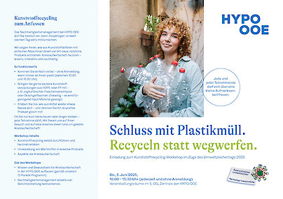 In der HYPO OOE widmen wir uns am 5. Juni der Kreislaufwirtschaft. Mit plasticpreneur Maschinen machen wir die Kreislaufwirtschaft erlebbar und Mitarbeitende haben die Möglichkeit, direkt Kunststoffabfälle in neue hochwertige Produkte zu rezyklieren. Dadurch schaffen wir Bewusstsein für den Kreislauf des Wertstoffs Kunststoff und bringen auch Kunststoffrecycling-Wissen in die Finanzbranche. Gleichzeitig werden die Grundlagen der Kreislaufwirtschaft präsentiert und eine Rückgabehilfe für Pfandflaschen im HYPO OOE Design ausgeteilt. Somit steht der Umweltzeichen-Tag ganz im Sinne der Kreislaufwirtschaft.