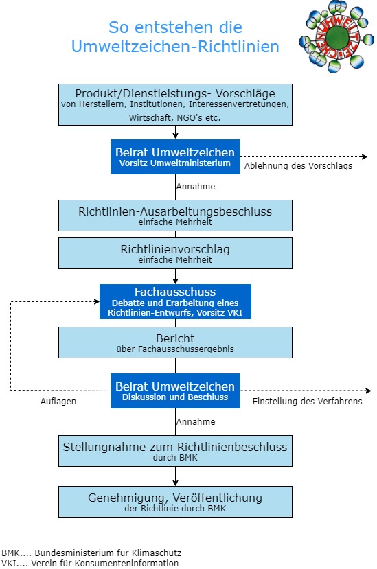 Eine Umweltzeichen-Richtlinie wird vom "Beirat Umweltzeichen", einem Beratungsgremium des Umweltministers, vorgeschlagen. Erarbeitet wird sie von einem Fachausschuss unter Vorsitz des Vereins für Konsumenteninformation (VKI).