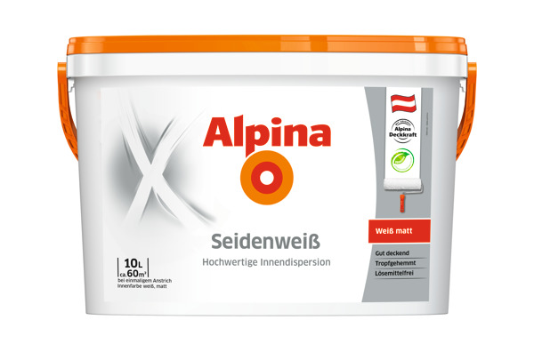 Hochwertige Dispersionsfarbe, welche frei von Löse- und Konservierungsmitteln ist. Die Farbe wurde tropfgehemmt eingestellt und besticht durch seine gute Deckkraft. Zusätzlich ist Alpina Seidenweiß geruchsarm sowie einfach zu verarbeiten. 15 L reichen für ca. 90 m²