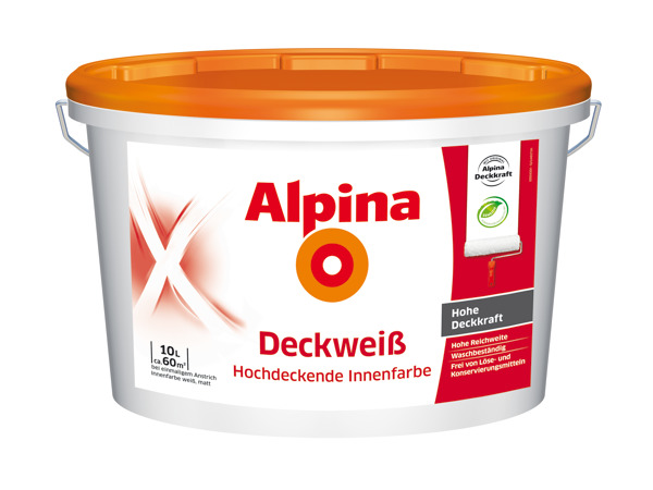 Matte Innendispersion für Wand- und Deckenanstriche auf allen üblichen Untergründen. Alpina Deckweiß hat eine sehr hohe Deckkraft sowie eine hohe Reichweite. Außerdem ist sie waschbeständig und frei von Löse- und Konservierungsmittel. 10 L reichen für ca. 60 m²