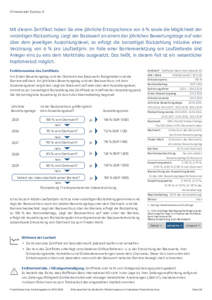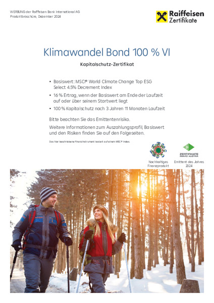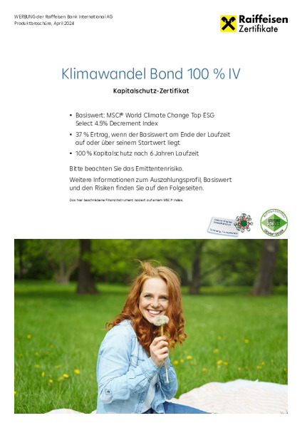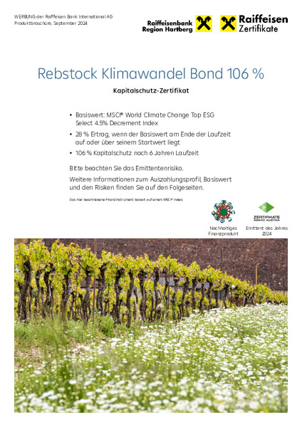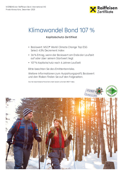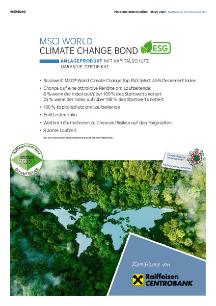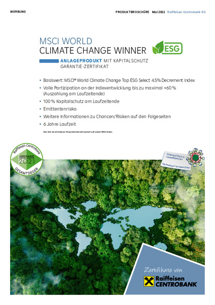 RCB Zertifikateserie auf Klimaschutz-Aktienthemenindizes (MSCI WORLD CLIMATE CHANGE TOP ESG SELECT INDEX bzw. MSCI WORLD CLIMATE CHANGE TOP ESG SELECT 4.5% DECREMENT INDEX)