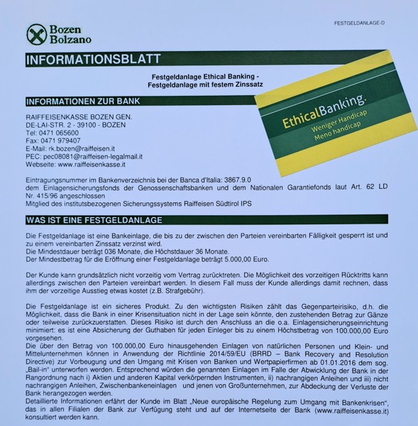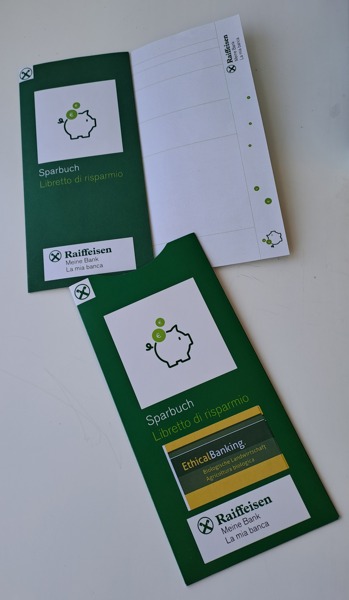 Another special feature is that the customer can choose his interest loan (which has a maximum) by himself and can therefore directly influence the interest rate on debt. Our Raiffeisen bank only has adds a minimum addition to the interest loan (1%). They do however resign on a piece of the profit. If the saver resigns on a piece of the interests, then this money goes directly to the supported project.