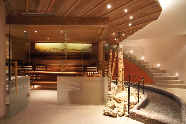 Selbst im Wellnessbereich sind die Berge ganz nah: in der Almsauna hängen Kuhglocken; zum Kneippen stolzieren Gäste durch den Gebirgsbach und im Wasserbett blicken Sehnsüchtige Wanderer auf die Tannheimer Gipfel und planen die nächste Bergtour.